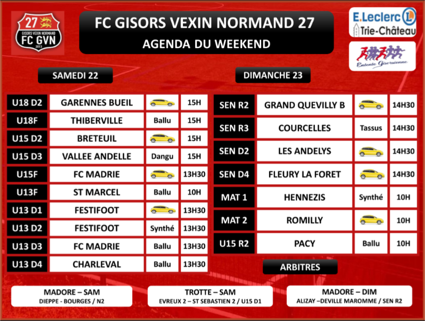 🔴 Pas de rencontres officielles pour nos Seniors ce weekend, l'équipe A se déplacera à St Ouen l'Aumône en amical. En Coupe de l'Eure, nos Matinaux recevront le FC Madrie pour une revanche de dimanche dernier.