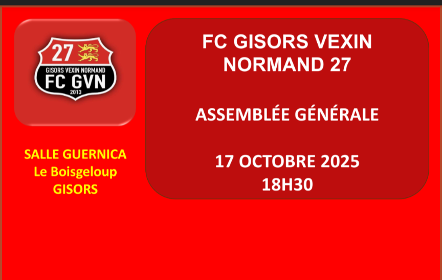 🔴 Le FC GVN 27 organise son Assemblée générale le vendredi 17 octobre 18h30 à la salle Guernica du Boisgeloup à Gisors. Nous y ferons le bilan financier et sportif de la saison passée et un point sur les enjeux de la nouvelle saison. Un pot de l'amitié sera servi à l'issue de l'Assemblée.