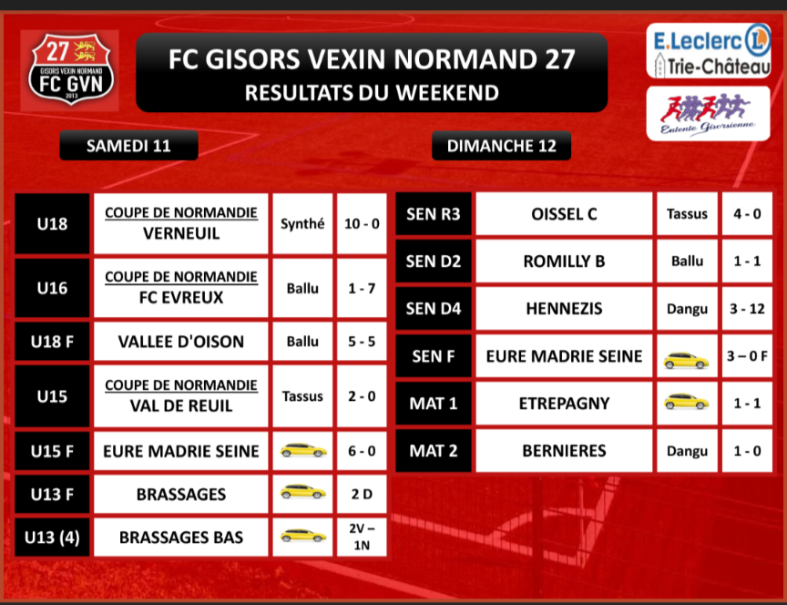 đź”´ La belle victoire (4-0) de nos Seniors R3 face Ă Oissel C leur permet de remonter en milieu de tableau. Nos Seniors D2 ont concĂ©dĂ© un nul (1-1) face Ă Romilly B tandis que nos Seniors D4 s'inclinaient (3-12) face Ă Hennezis.Â